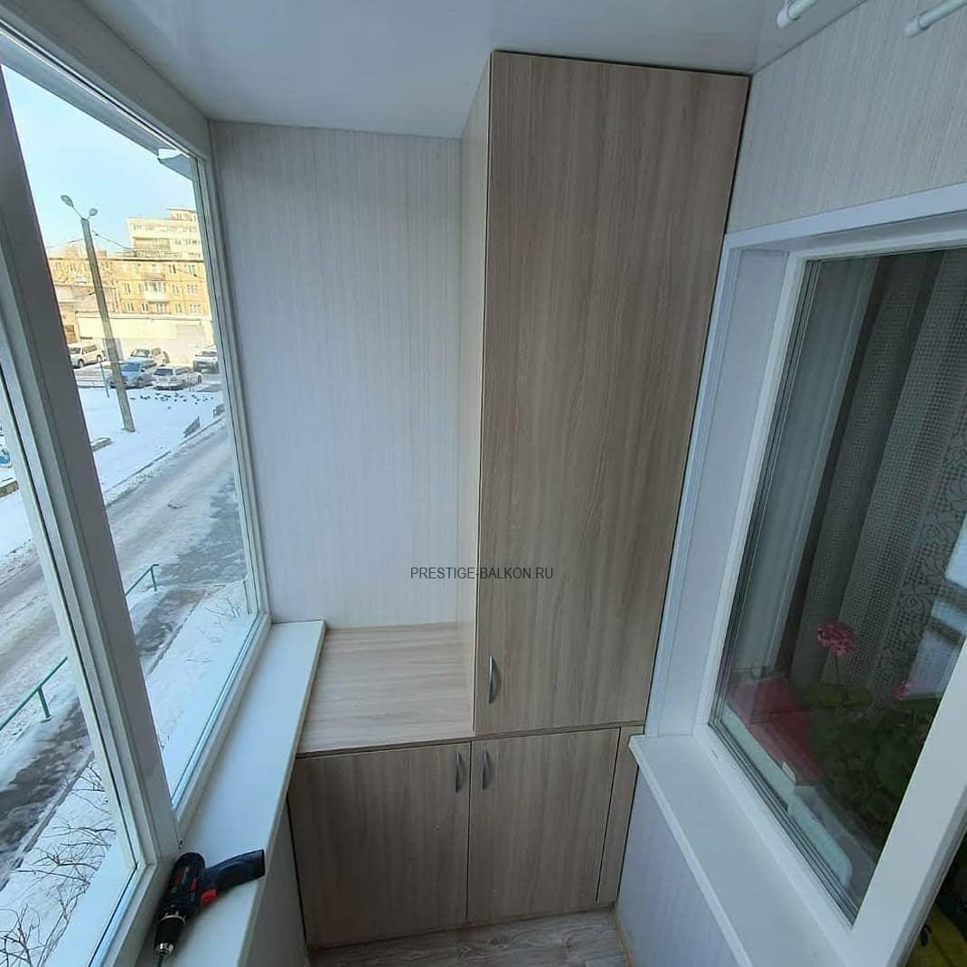 Первым этапом произведена установка теплого остекления профилем Rehau Grazio 70 мм с двухкамерным стеклопакетом. Далее выполнен ремонт стен и потолка панелями ПВХ с утеплением. Возведен черновой пол из влагостойкой фанеры и поверх настелен ламинат. Проведена электрофикация, установлены розетки и выключатель. Заключительным этапом был собран шкаф из ЛДСП.